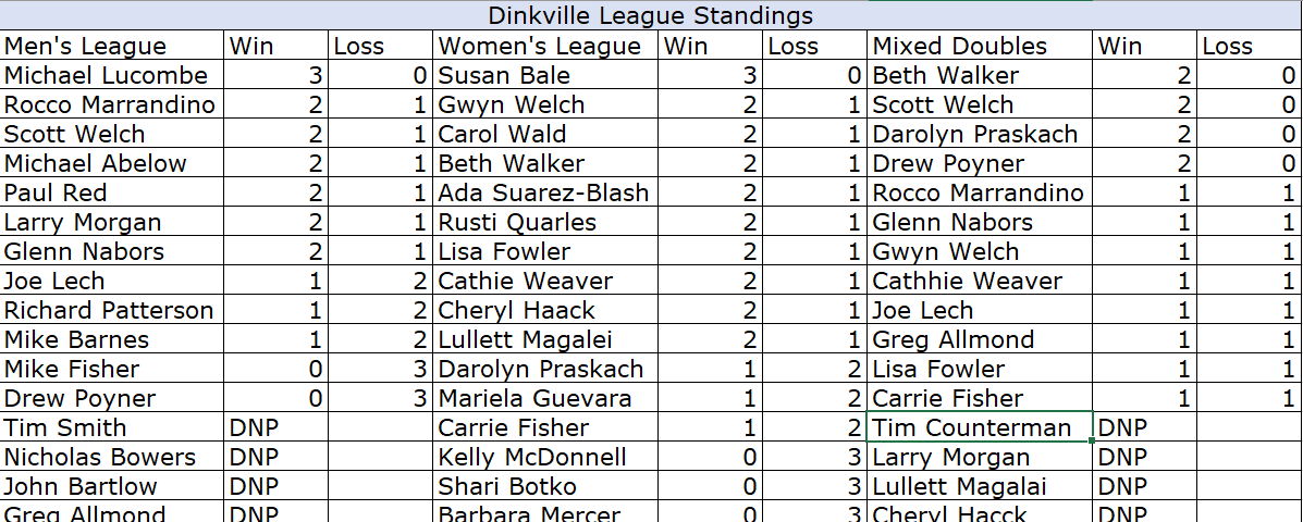 Nice work on competing and giving feedback on the league so we can improve going forward. We cannot wait to continue to grow the league play and make Dinkville the #1 Pickleball Community in TN.