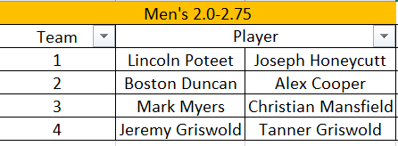 Men's 2.0-2.75. 3 pool games to 11, win by 2. Single Elimination Bracket, Best 2/3 Games to 11, win by 2