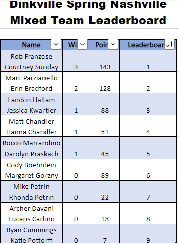 Standings are based off scores that have been submitted through the League Submission Form! Scores have also been recorded to DUPR so please review and make sure they are all correct! If you have any questions, please reach out to me at Landon@dinkville.com!