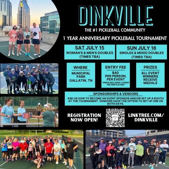 Join us for Dinkville's first Anniversary Tournament July 15-16 at Municipal Park in Gallatin, TN. Men and Women Brackets on Saturday July 15th; Mixed and Singles Brackets on Sunday July 16th. Each team will be guaranteed 5 Games and a Tournament T-Shirt! All levels are welcome so find a partner and come on out for a fun summer weekend of Pickleball! If you need help finding a partner please make sure to jump in our Community Discord! Sign Up Today Here