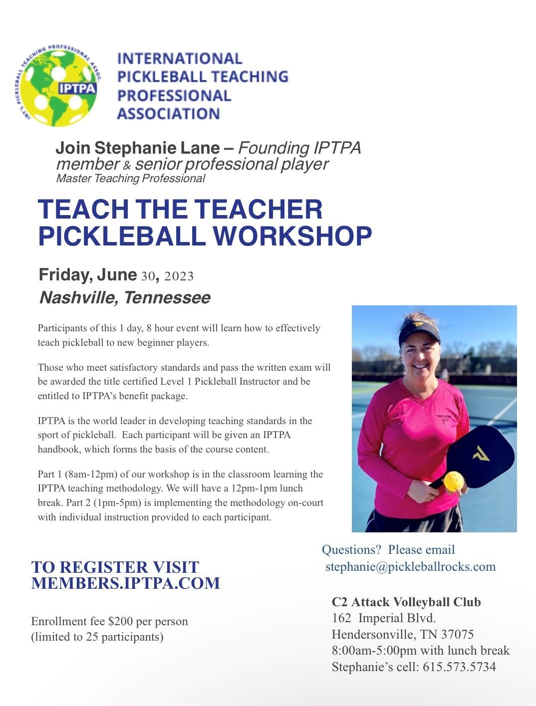 Stephanie Lane Teach The Teacher Workshop is on for June 30th at C2 Pickleball in Hendersonville, TN. Make sure to sign up today at there is only 25 spots available! Sign Up Here or contact Stephanie at Stephanie@pickleballrocks.com.