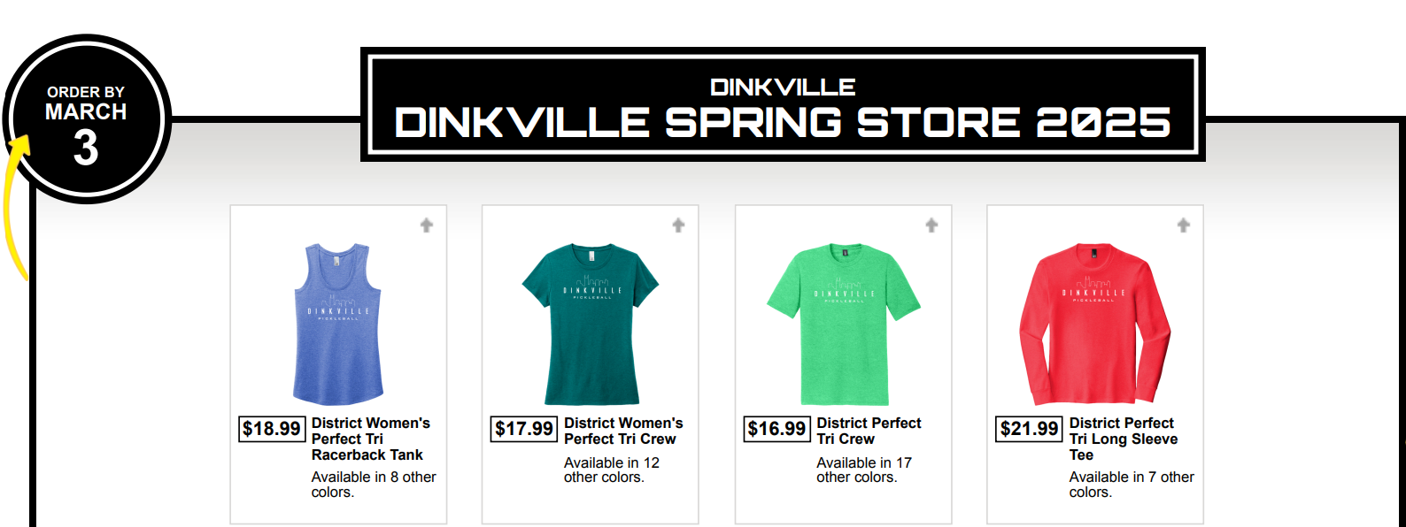 Spring is right around the corner, and you know what that means—time to level up your pickleball swag! Our online store is open, but not for long. It closes Monday, so now’s your chance to grab your Dinkville shirts and tank tops for $20 or less!