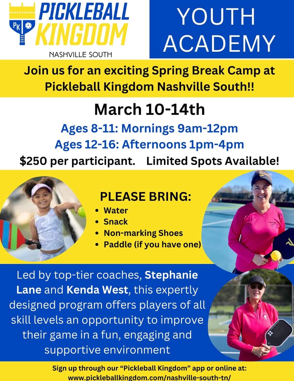 We’ve got an amazing opportunity for young players to learn from the best! Join us for the Pickleball Kingdom Youth Academy from March 10th–14th, where kids will be coached by none other than Stephanie Lane (the Queen of Pickleball) and Kenda West!