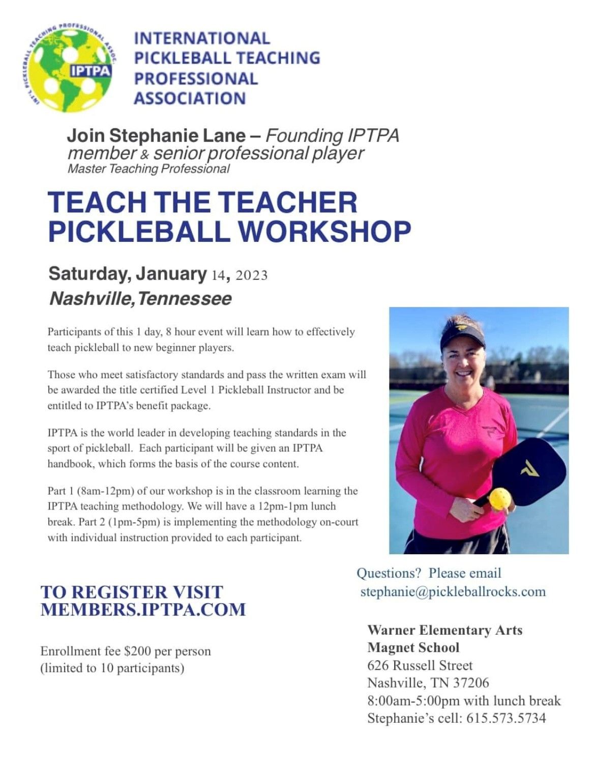Dinkville Member Stephanie Lane is the Queen of Pickleball in Nashville, TN as she has done SO MUCH for city and community on learning and playing the great game. Lane has now added International Pickleball Teaching Professional Association (IPTPA) Level 1- Teach The Teacher Workshop in Nashville, TN on Saturday Janurary 14th. If you have any questions please reach out to Stephanie Lane at stephanie@pickleballrocks.com.