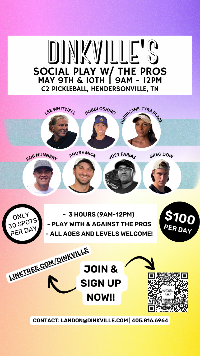 Want to team up with a Pro? Or think you can take down the Pros with your partner? Sign up for a Dinkville Exclusive Social Play with the Pros at C2 Pickleball in Hendersonville on May 9th and May 10th at 9am-12pm for just $100/per day. This is a Private Event with Limited spots available so make sure to sign up fast! Click here to sign up!